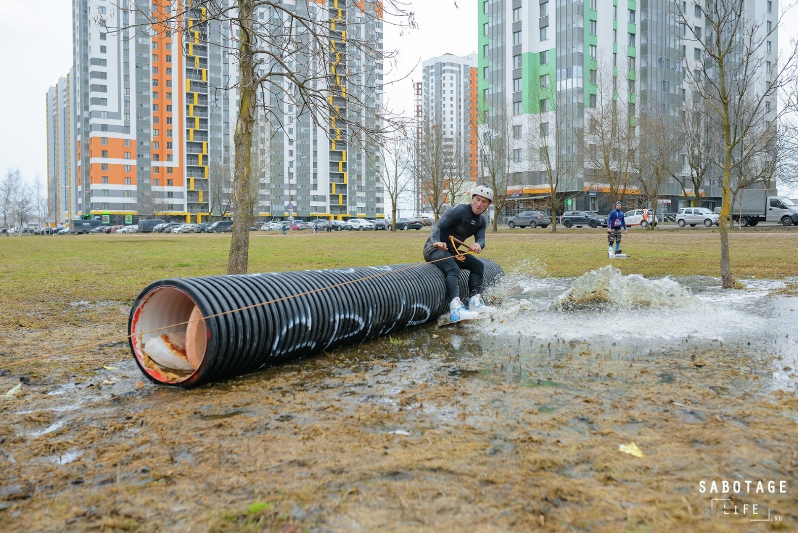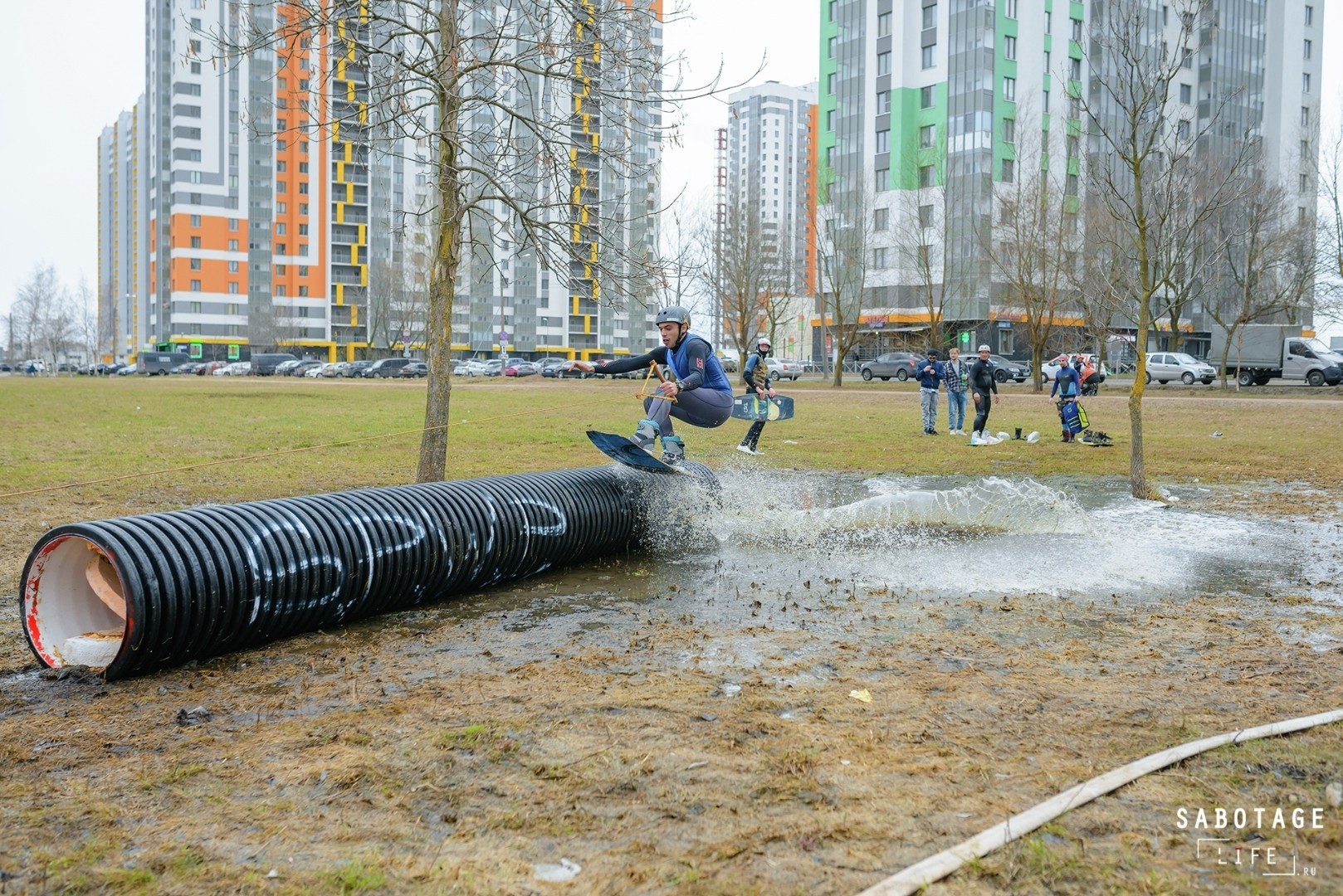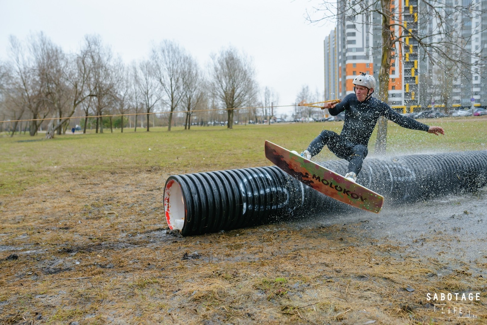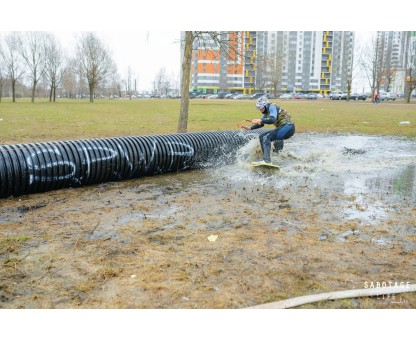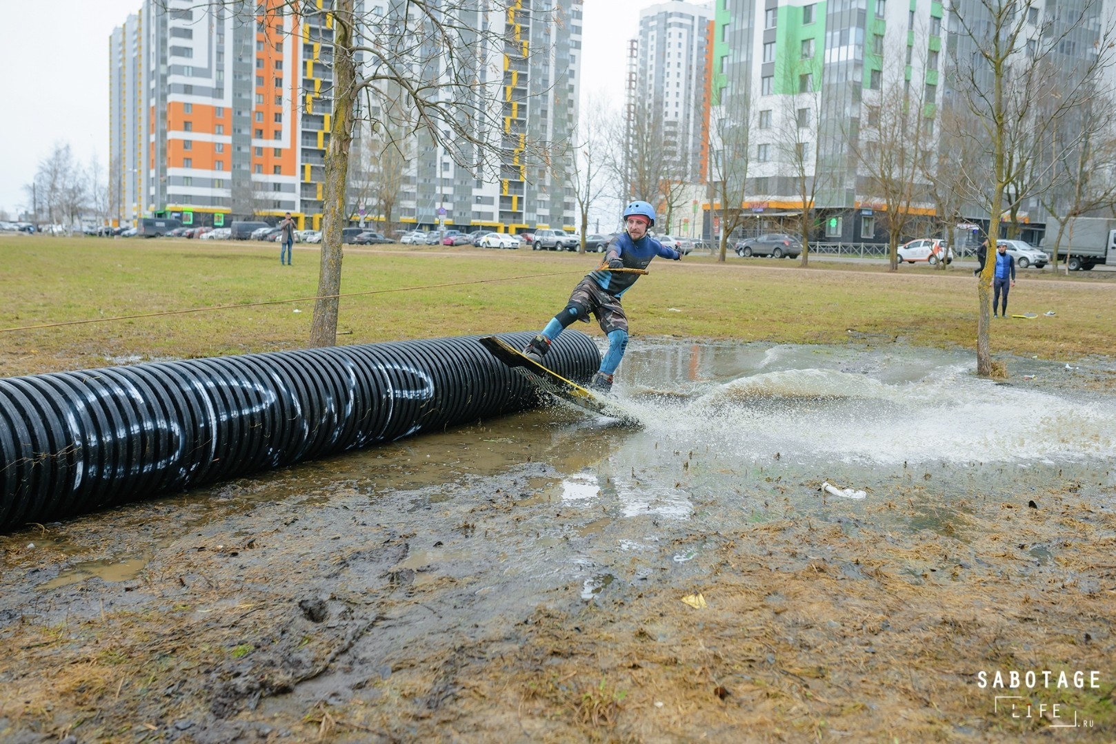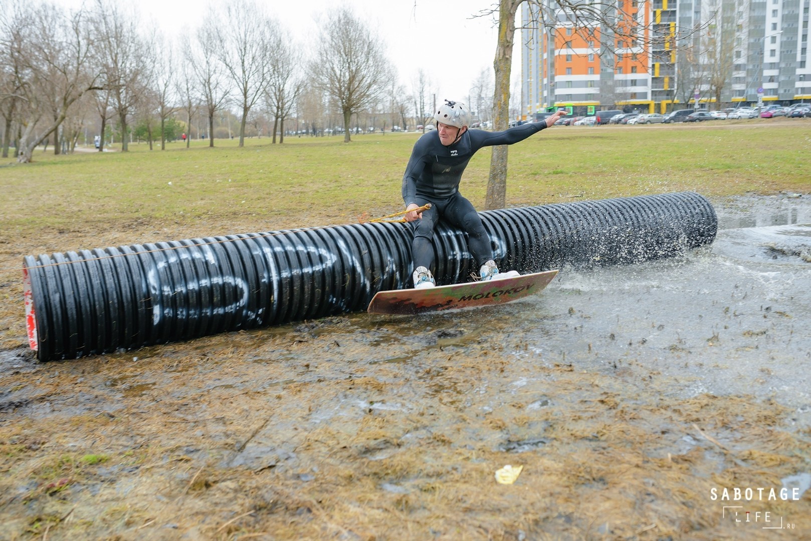 В парке организаторы подобрали подходящую по глубине и длине лужу, в которую установили 2 гофрированные трубы диаметром 600 и 300мм, по которым райдеры-вейкбордисты скользили на досках. Тягу обеспечила портативная канатно-буксировочная установка – лебедка, в простонародье «винч».