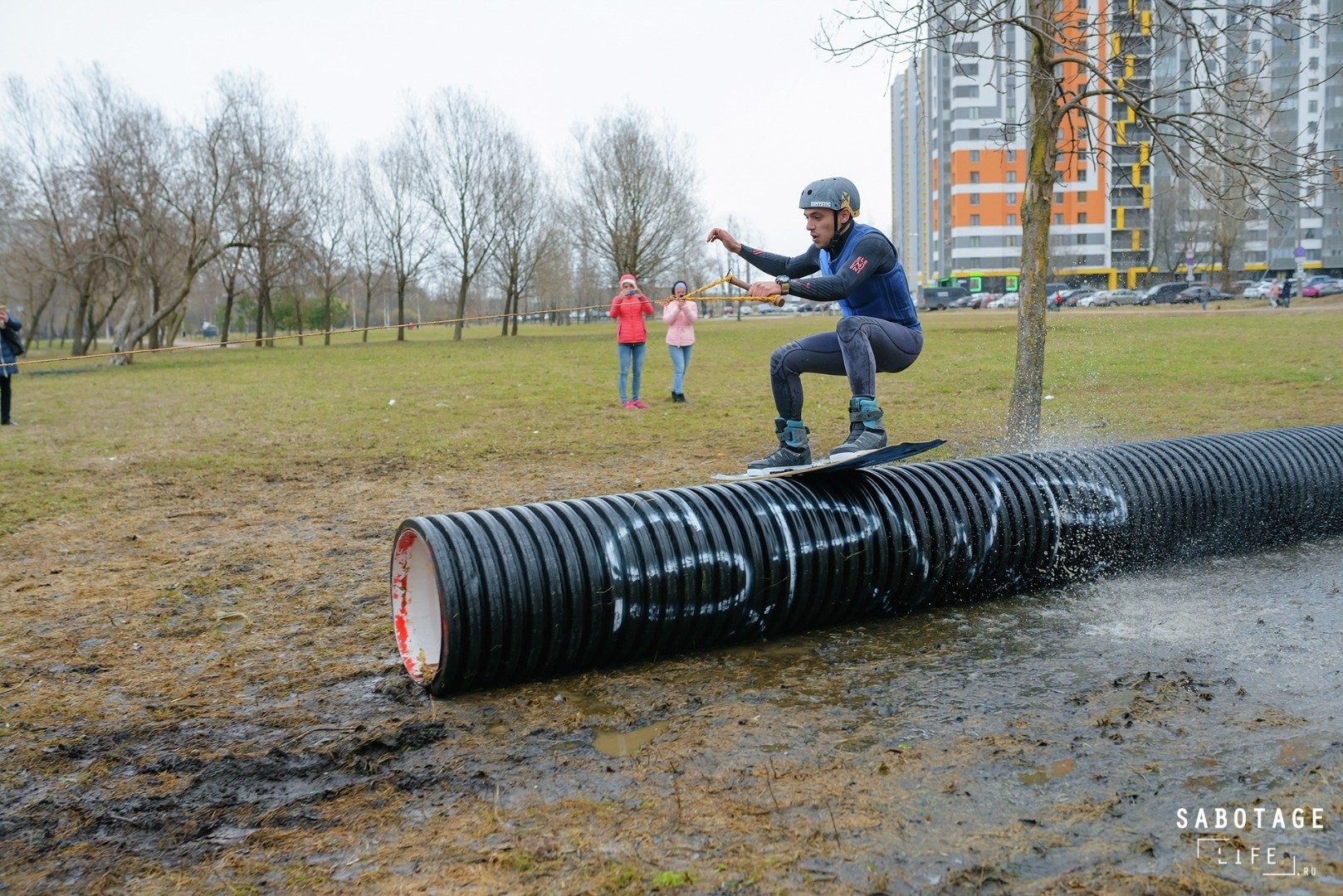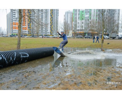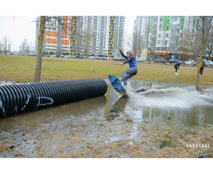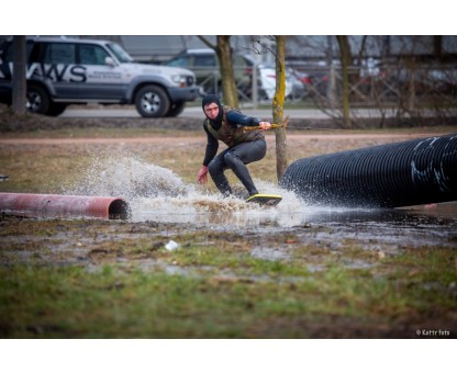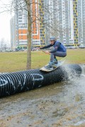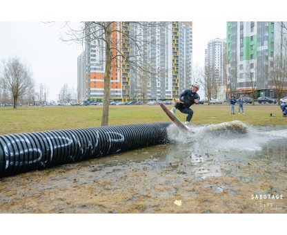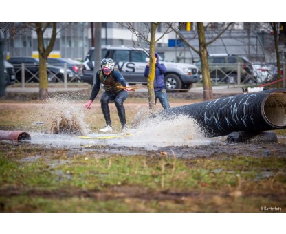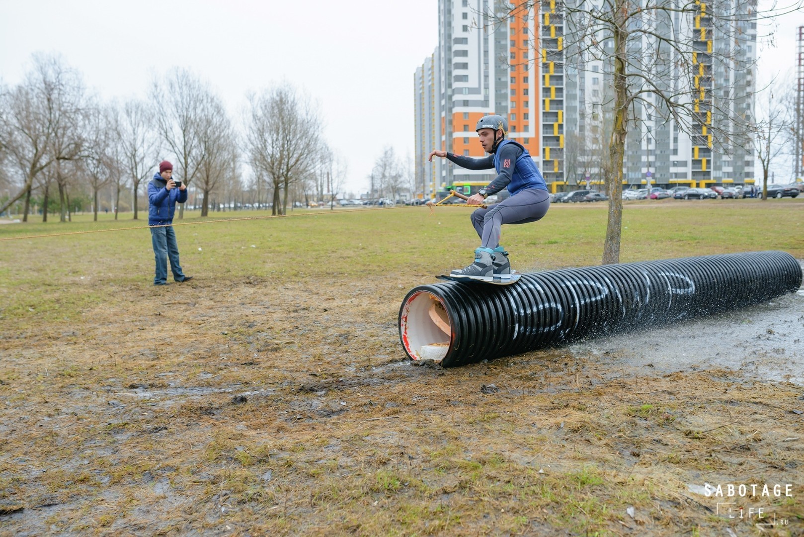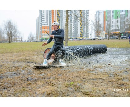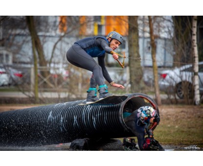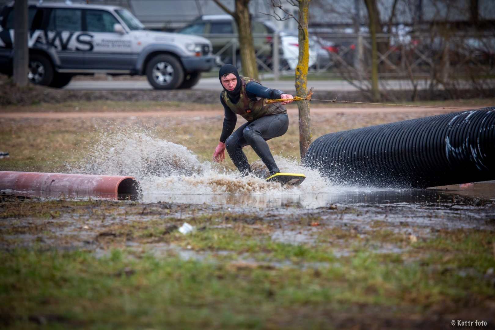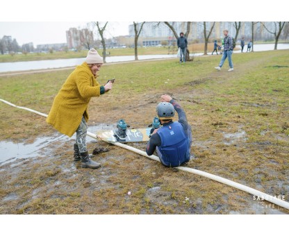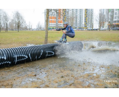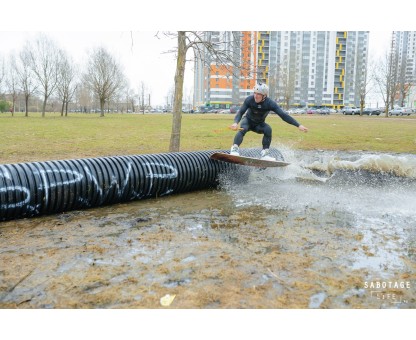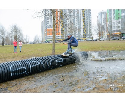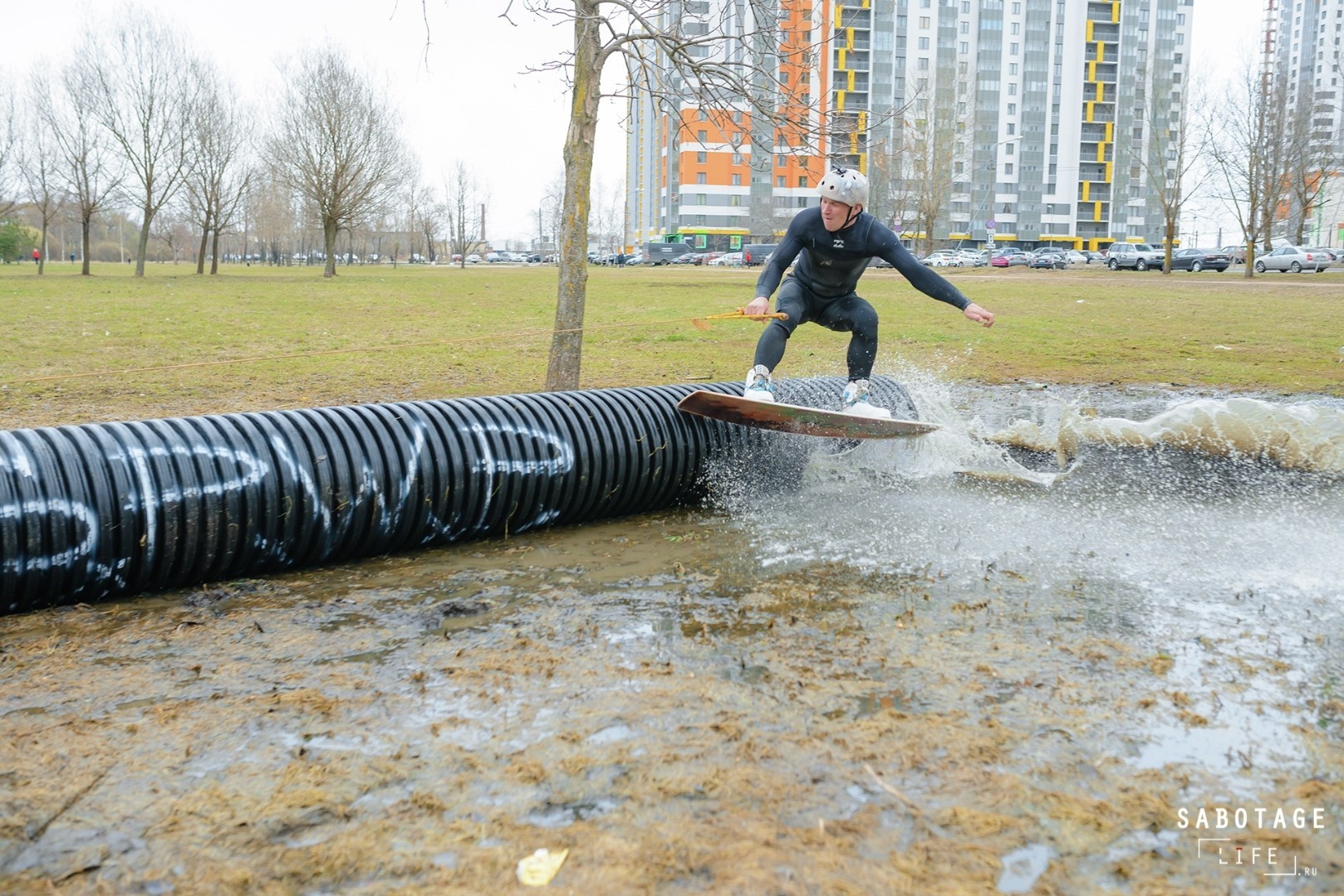 В парке организаторы подобрали подходящую по глубине и длине лужу, в которую установили 2 гофрированные трубы диаметром 600 и 300мм, по которым райдеры-вейкбордисты скользили на досках. Тягу обеспечила портативная канатно-буксировочная установка – лебедка, в простонародье «винч».