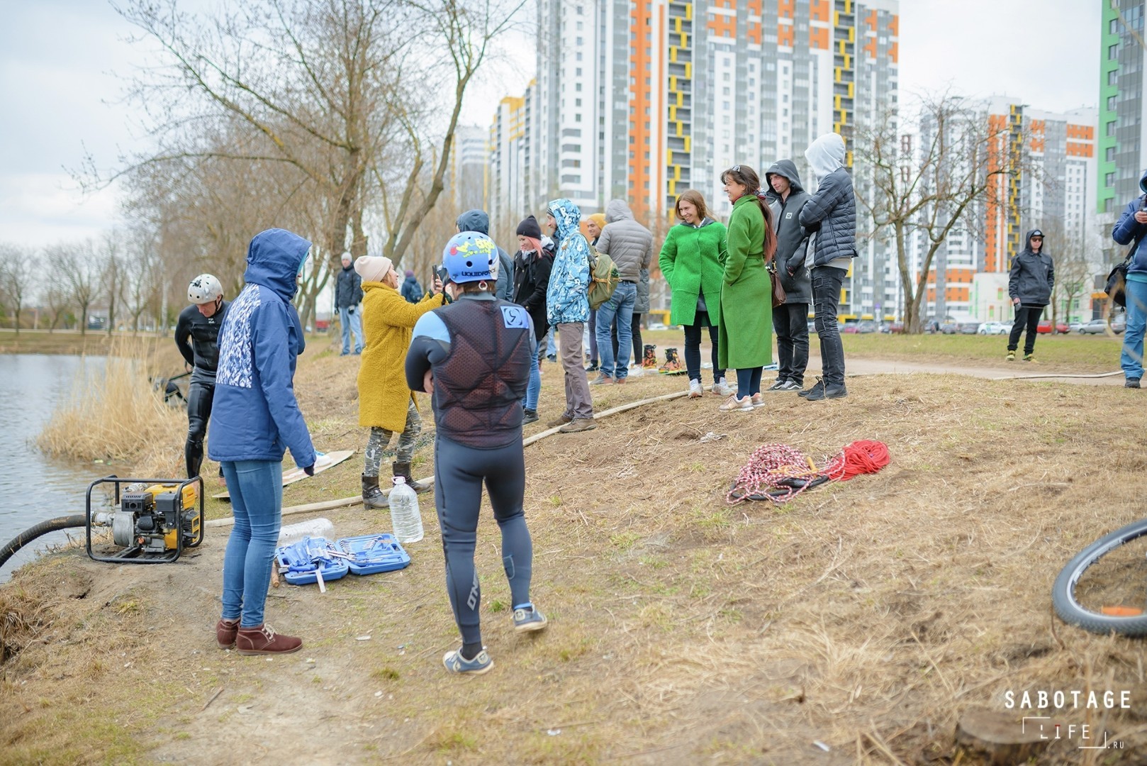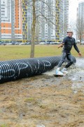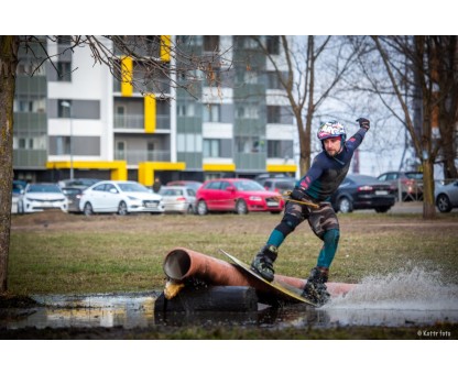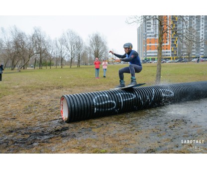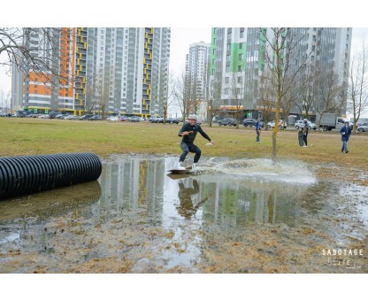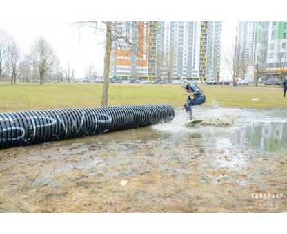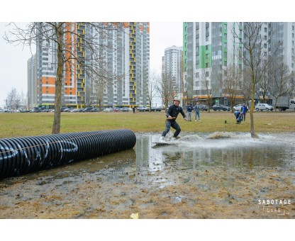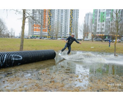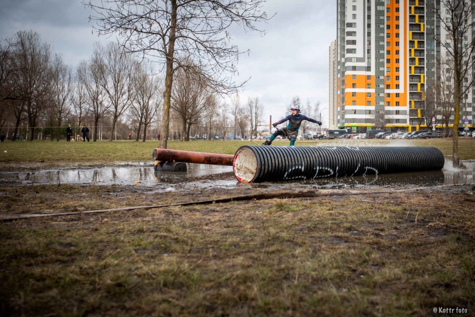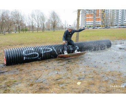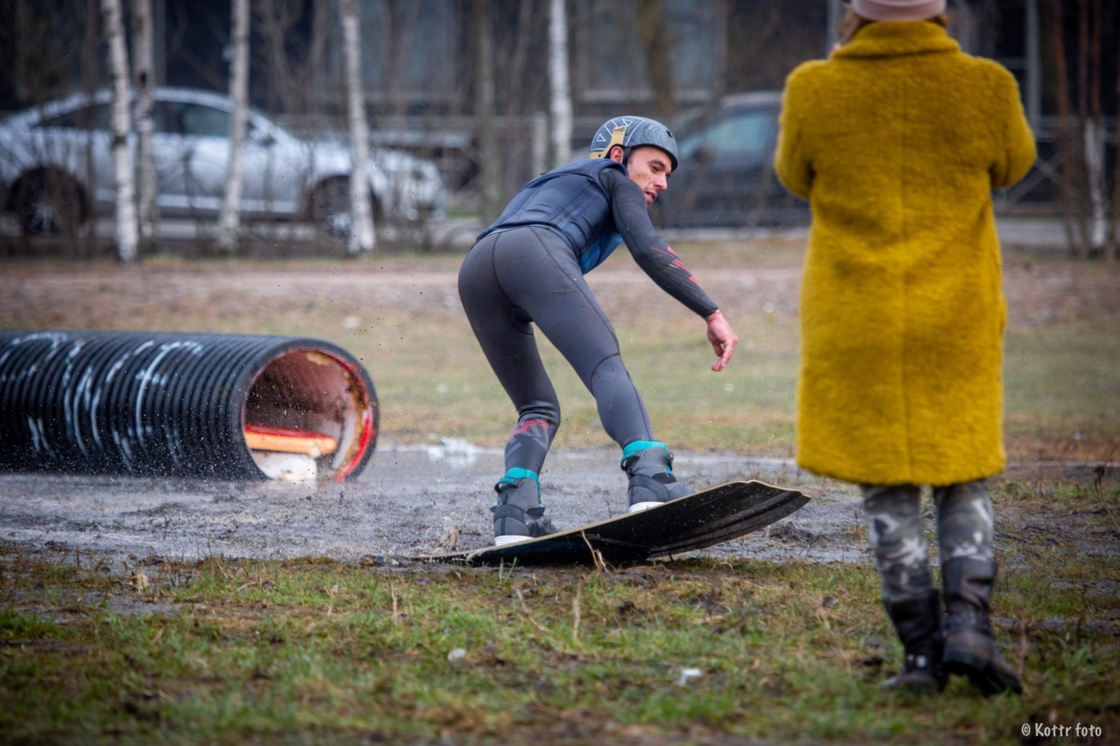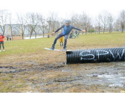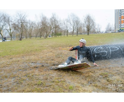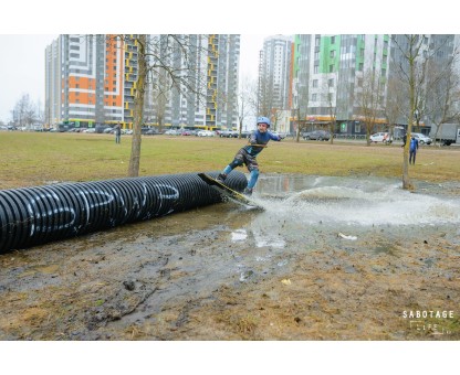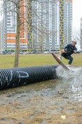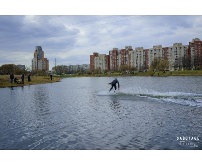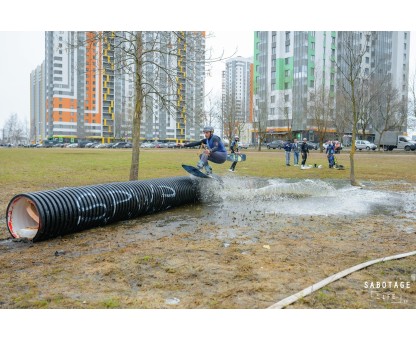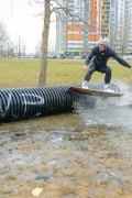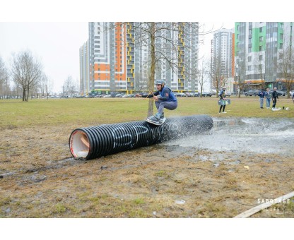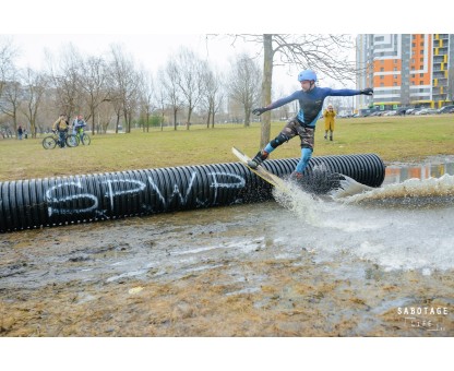В парке организаторы подобрали подходящую по глубине и длине лужу, в которую установили 2 гофрированные трубы диаметром 600 и 300мм, по которым райдеры-вейкбордисты скользили на досках. Тягу обеспечила портативная канатно-буксировочная установка – лебедка, в простонародье «винч».