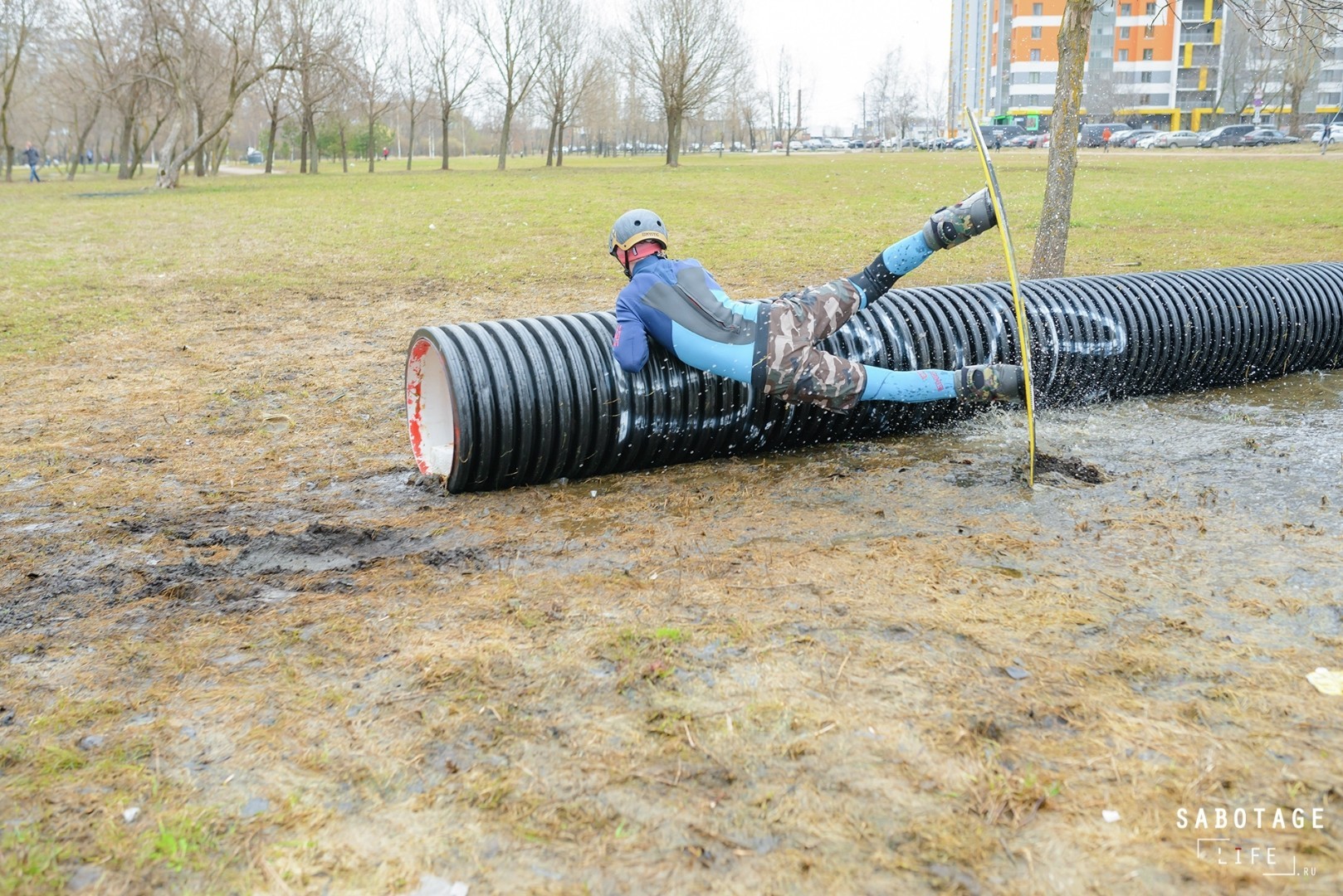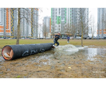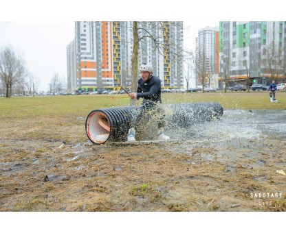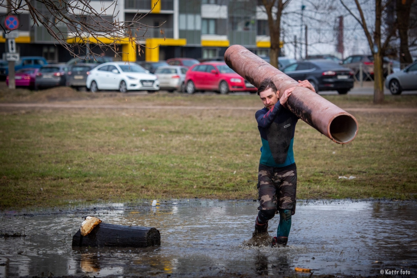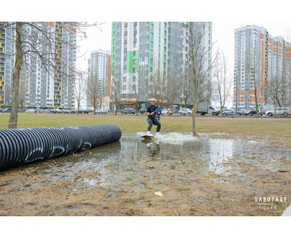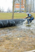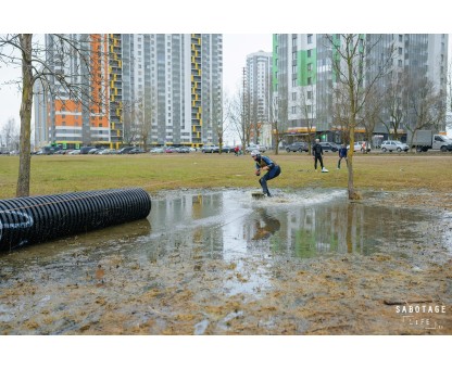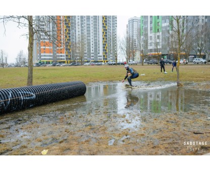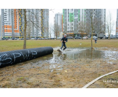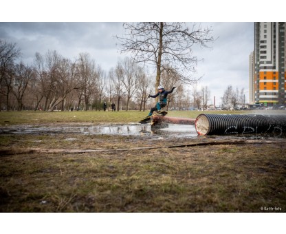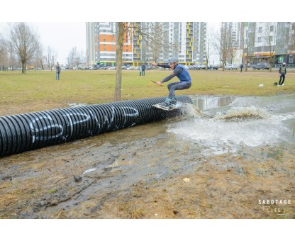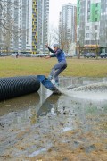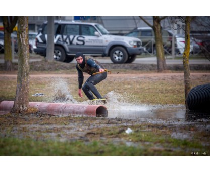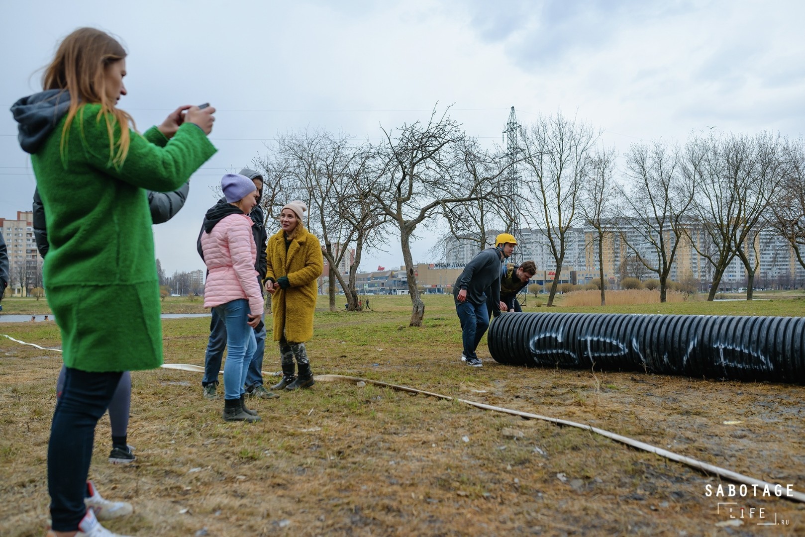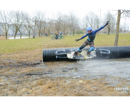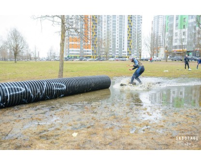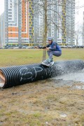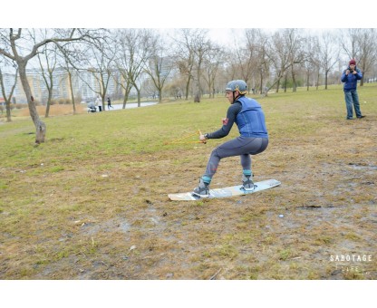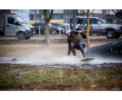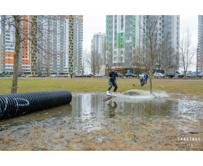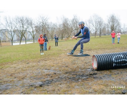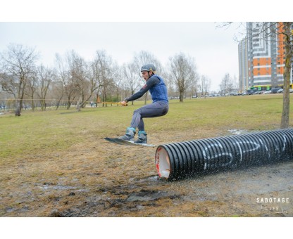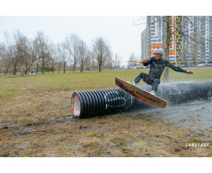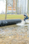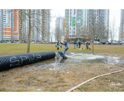 В парке организаторы подобрали подходящую по глубине и длине лужу, в которую установили 2 гофрированные трубы диаметром 600 и 300мм, по которым райдеры-вейкбордисты скользили на досках. Тягу обеспечила портативная канатно-буксировочная установка – лебедка, в простонародье «винч».