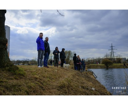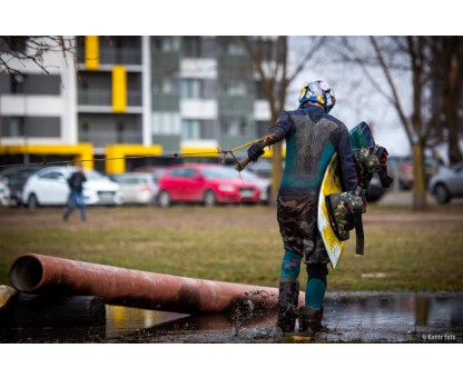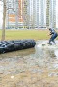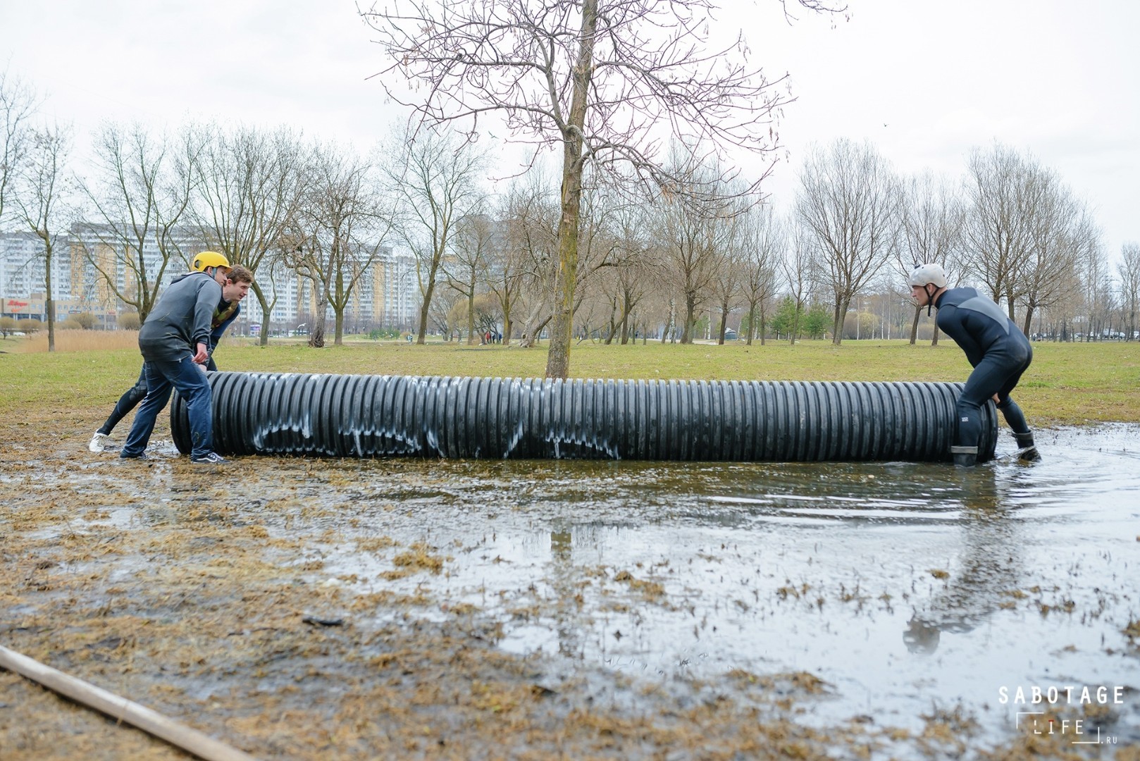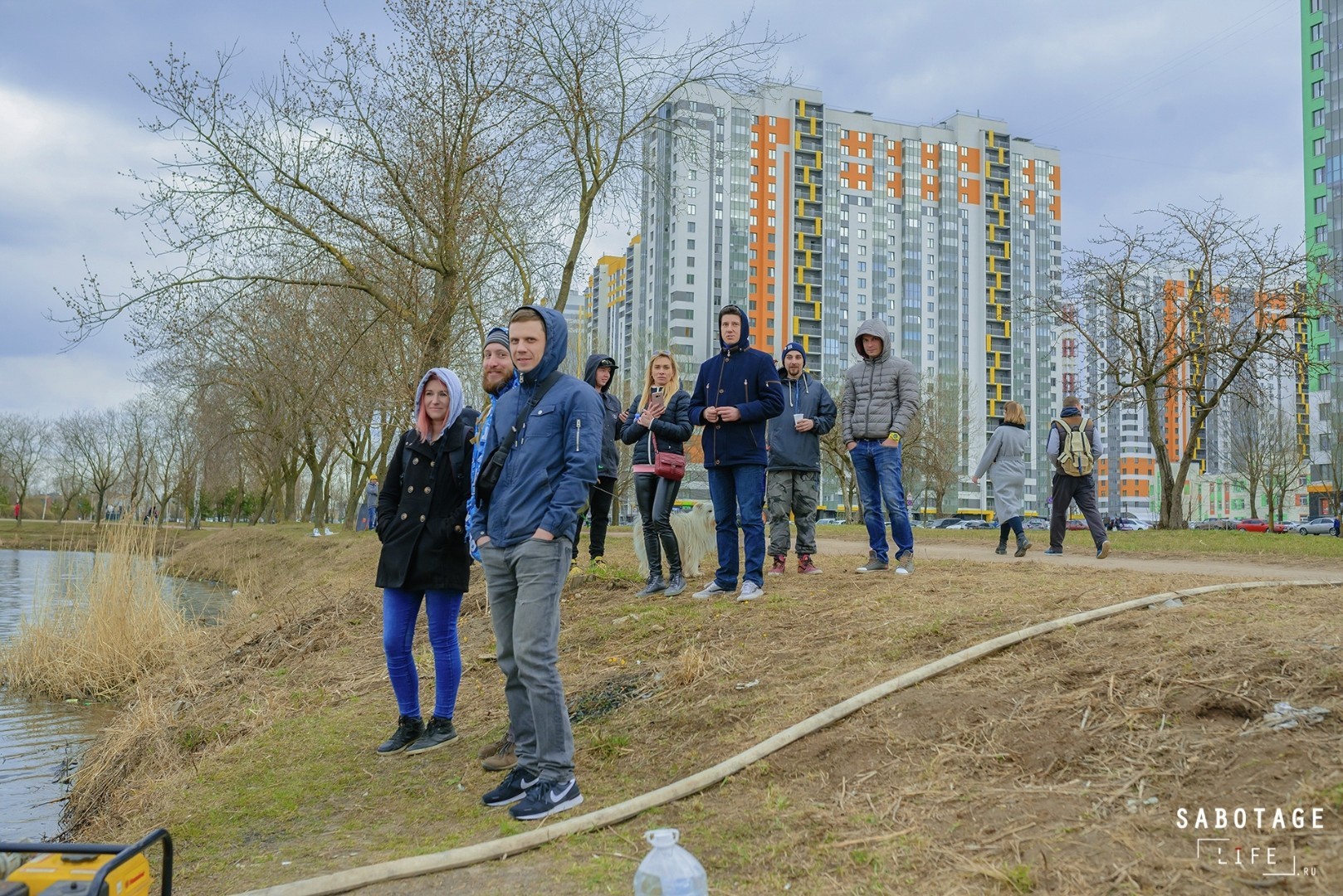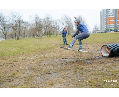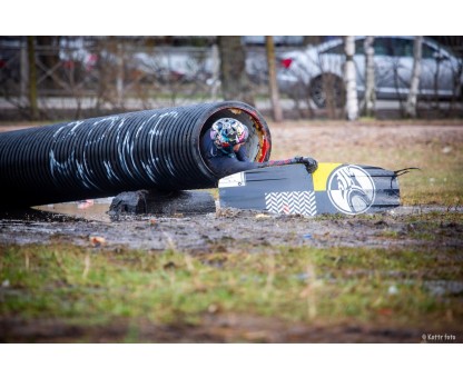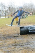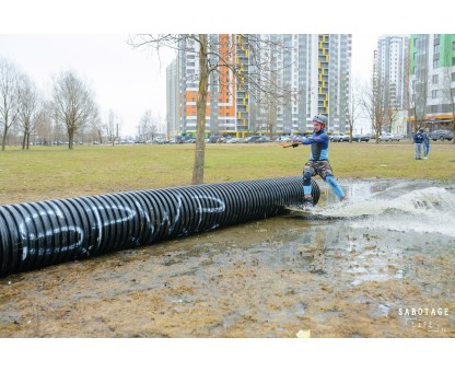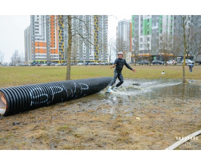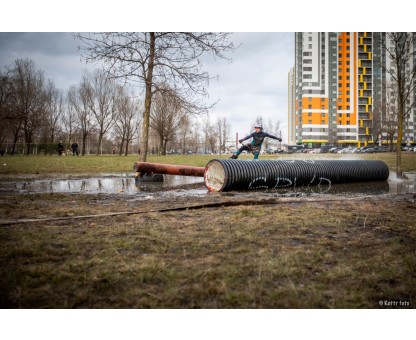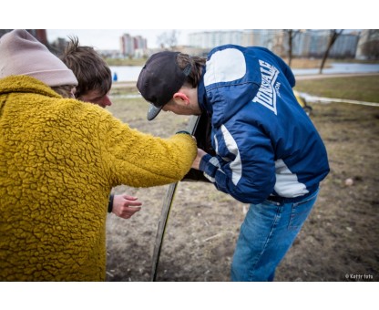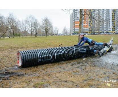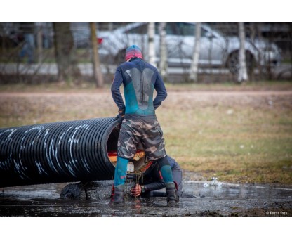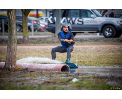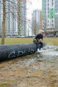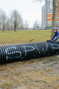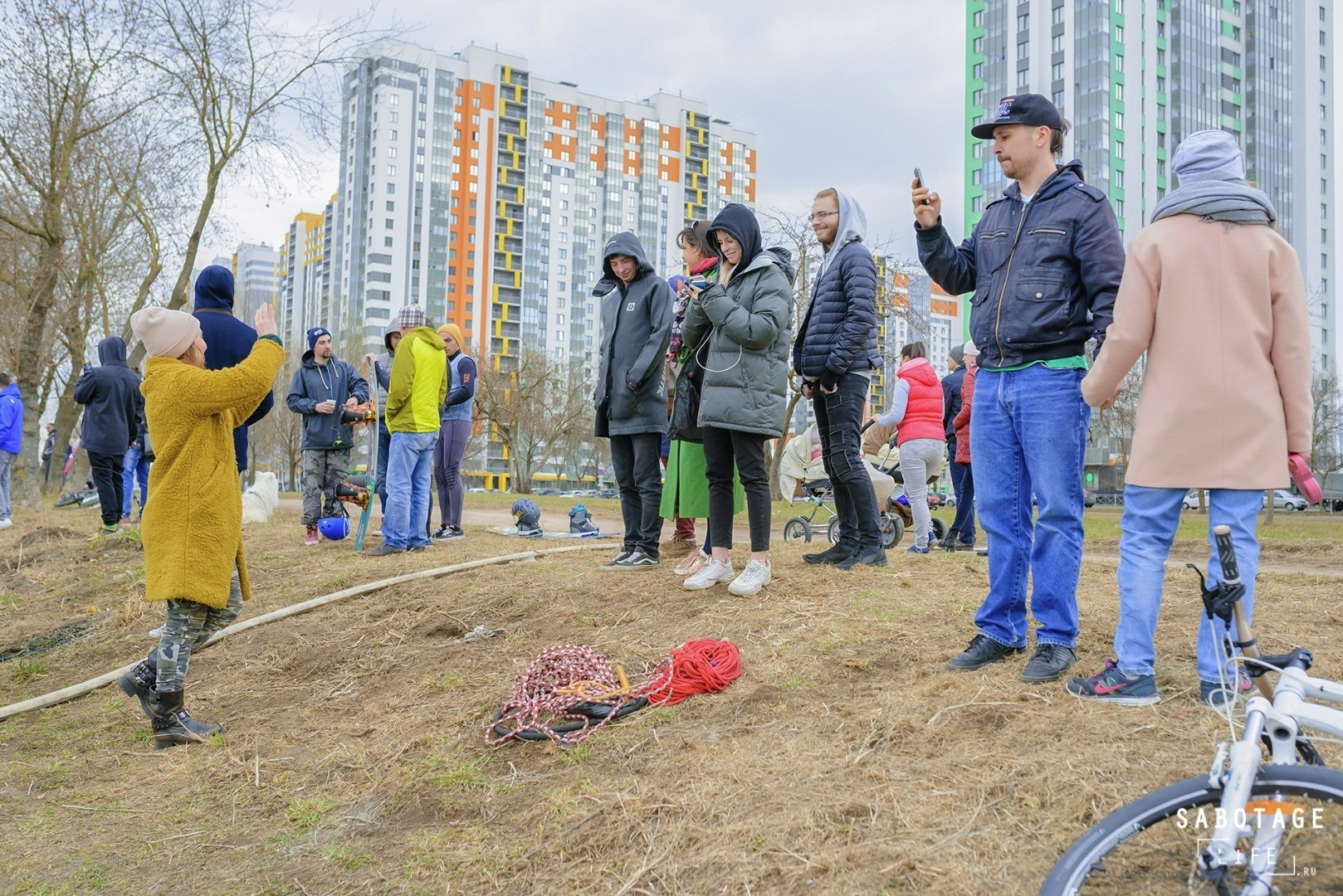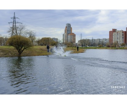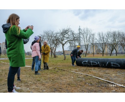 В парке организаторы подобрали подходящую по глубине и длине лужу, в которую установили 2 гофрированные трубы диаметром 600 и 300мм, по которым райдеры-вейкбордисты скользили на досках. Тягу обеспечила портативная канатно-буксировочная установка – лебедка, в простонародье «винч».